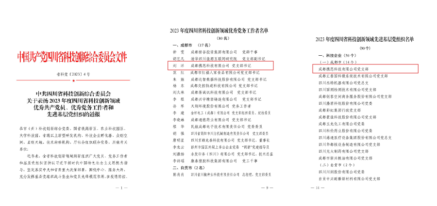 成都攜恩科技有限公司黨支部榮獲“2023年度四川省科技創(chuàng)新領(lǐng)域先進(jìn)基層黨組織”;成都攜恩科技有限公司黨支部書記、董事長(zhǎng)劉洋榮獲“2023 年度四川省科技創(chuàng)新領(lǐng)域優(yōu)秀黨務(wù)工作者”。